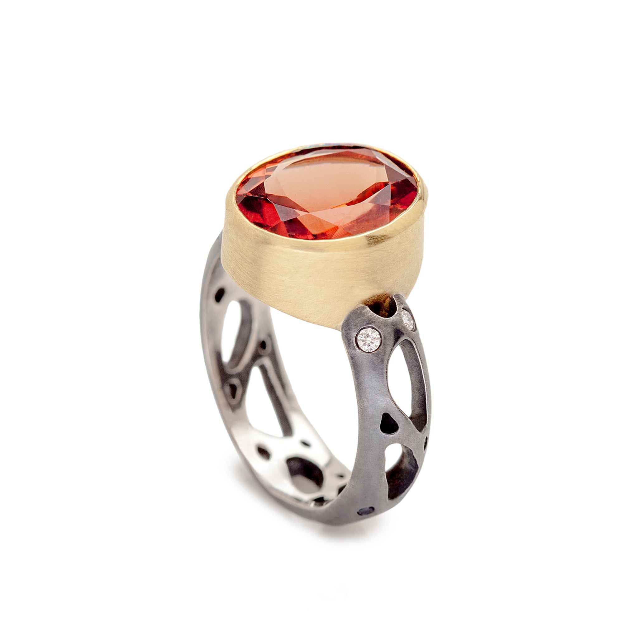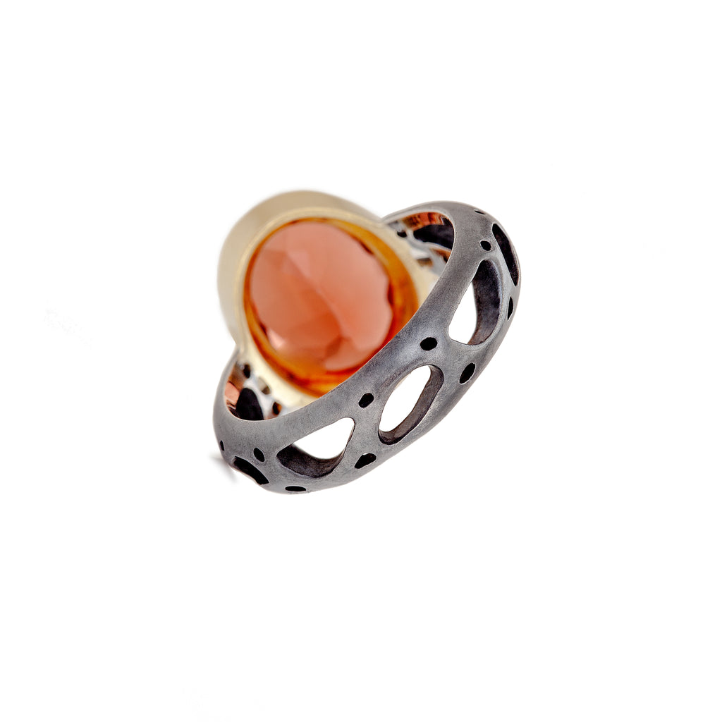 Sterling Silver (Oxidized Finish) & 18Kt Gold Ring with Orange Labradorite & Diamonds - 0,04 cts